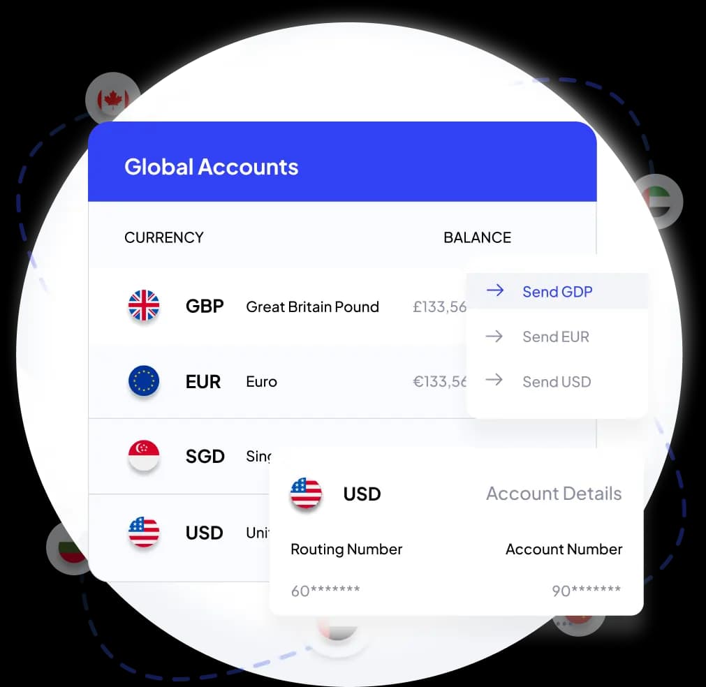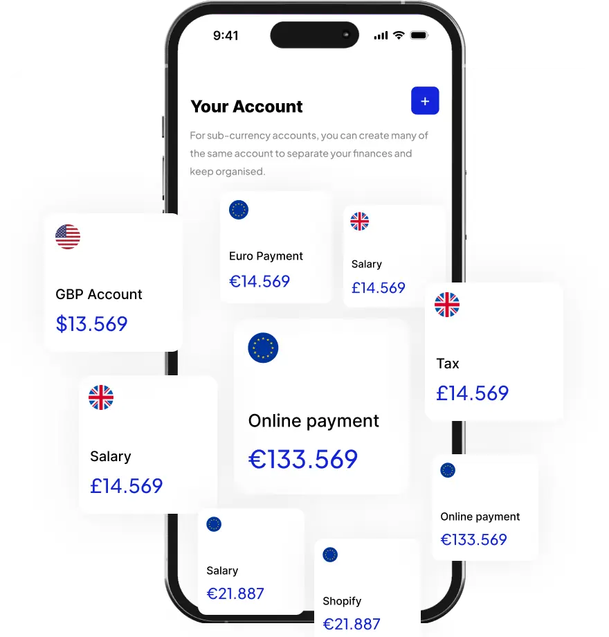 Local currency accounts in GBP, USD, EUR.